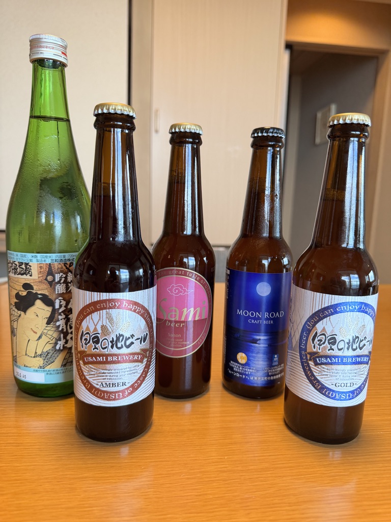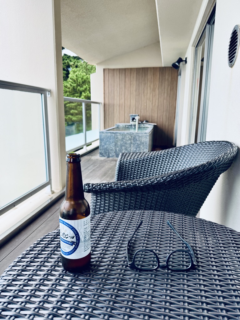 バルコニーにはチェア2脚とテーブル、露天温泉があり、宿の近くにある吟酒 むらためで仕入れてきた地ビールをいただく。