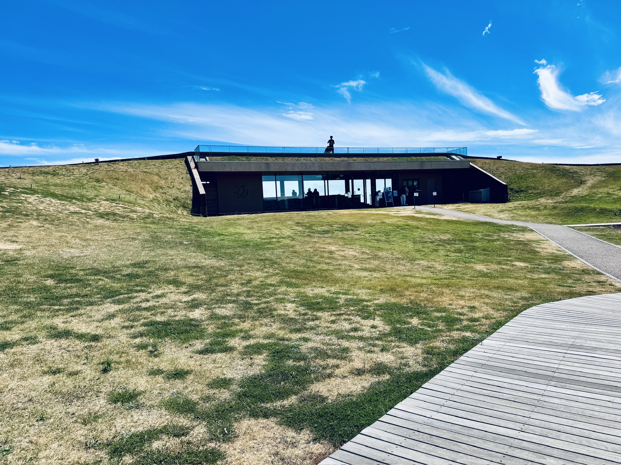 リフトで山頂へ登る。大桟橋のようなウッドデッキがあり、カフェもおしゃれな感じ。