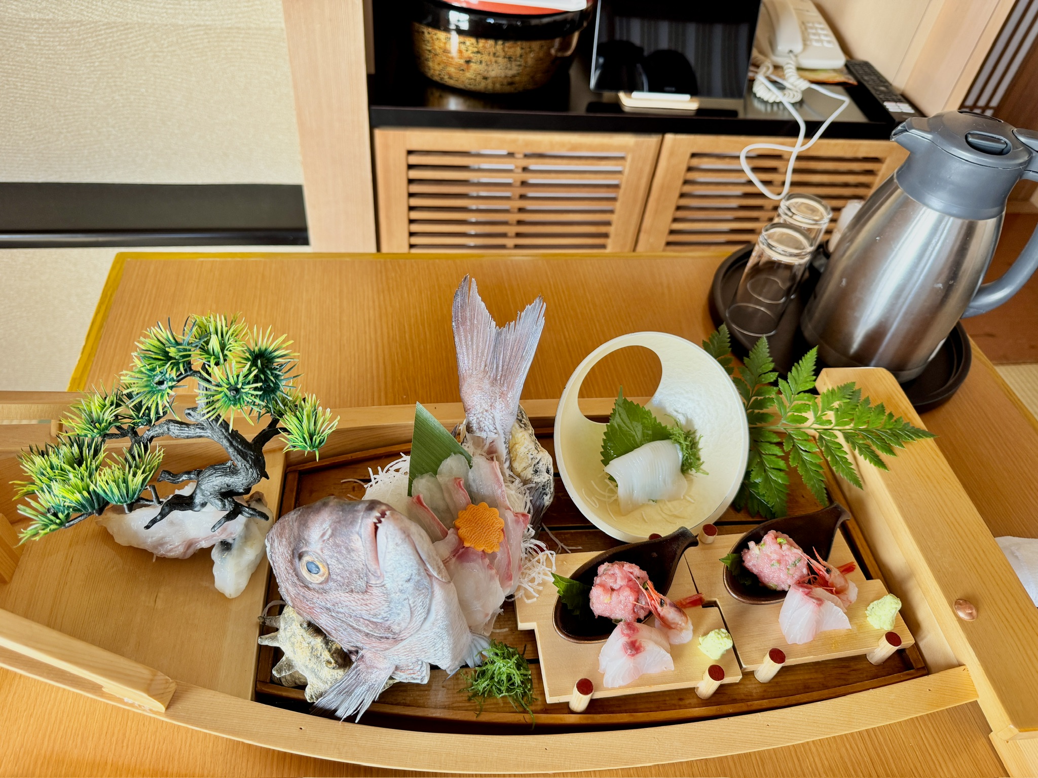 朝から舟盛り。あと、写真はないが部屋でアジの干物も焼いてくれた。